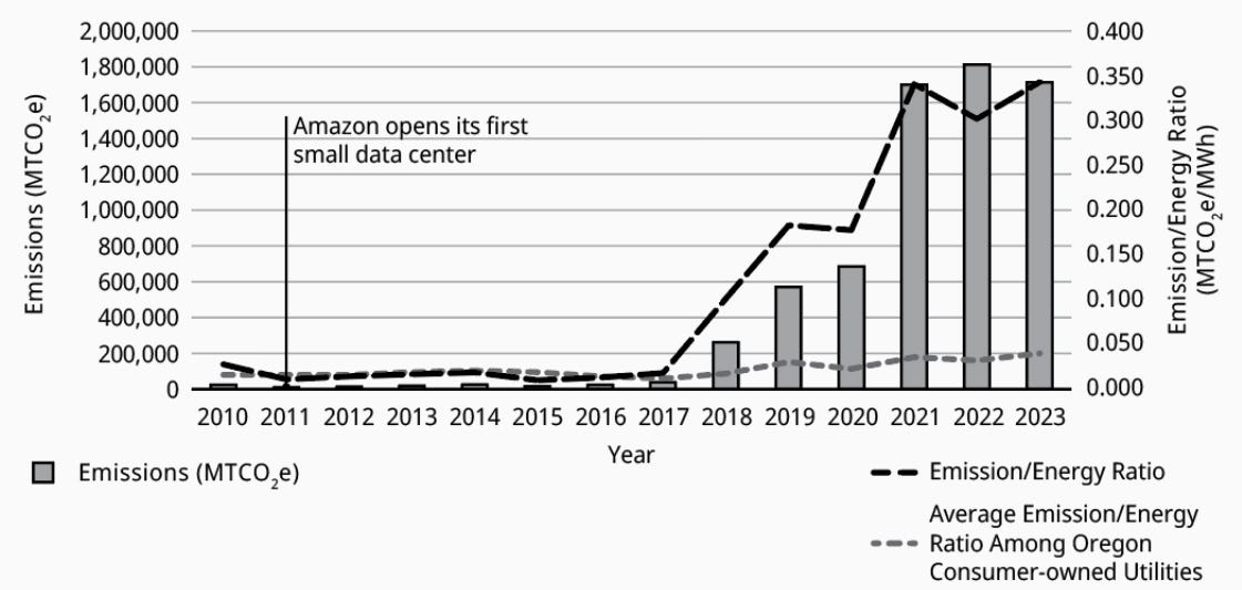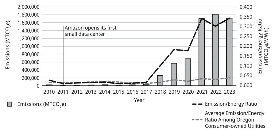 With more data centers has come a surge in carbon emissions. Umatilla Electric Cooperative, which serves both Umatilla and Morrow Counties, has become the third-largest greenhouse gas emitter among all Oregon utilities. The reason? Amazon.