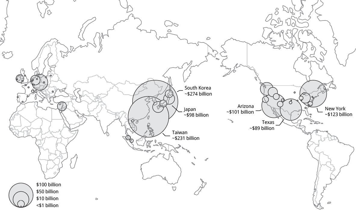 What emerged was a geopolitical industrial boom, marked by state-backed investments of unprecedented scale: Intel’s $100 billion expansion in Ohio, TSMC’s ~$165 billion in Arizona, Samsung’s $98 billion in South Korea, and Micron’s $100 billion in New York. Yet this mobilization of public funds did not disrupt the distribution of power in the industry. Instead, it consolidated the position of incumbent oligopolies while embedding new territorial inequalities—reproducing a global infrastructure of high-tech development structured around monopoly control, geopolitical dependency, and state-capital alliances under the banner of economic security.
