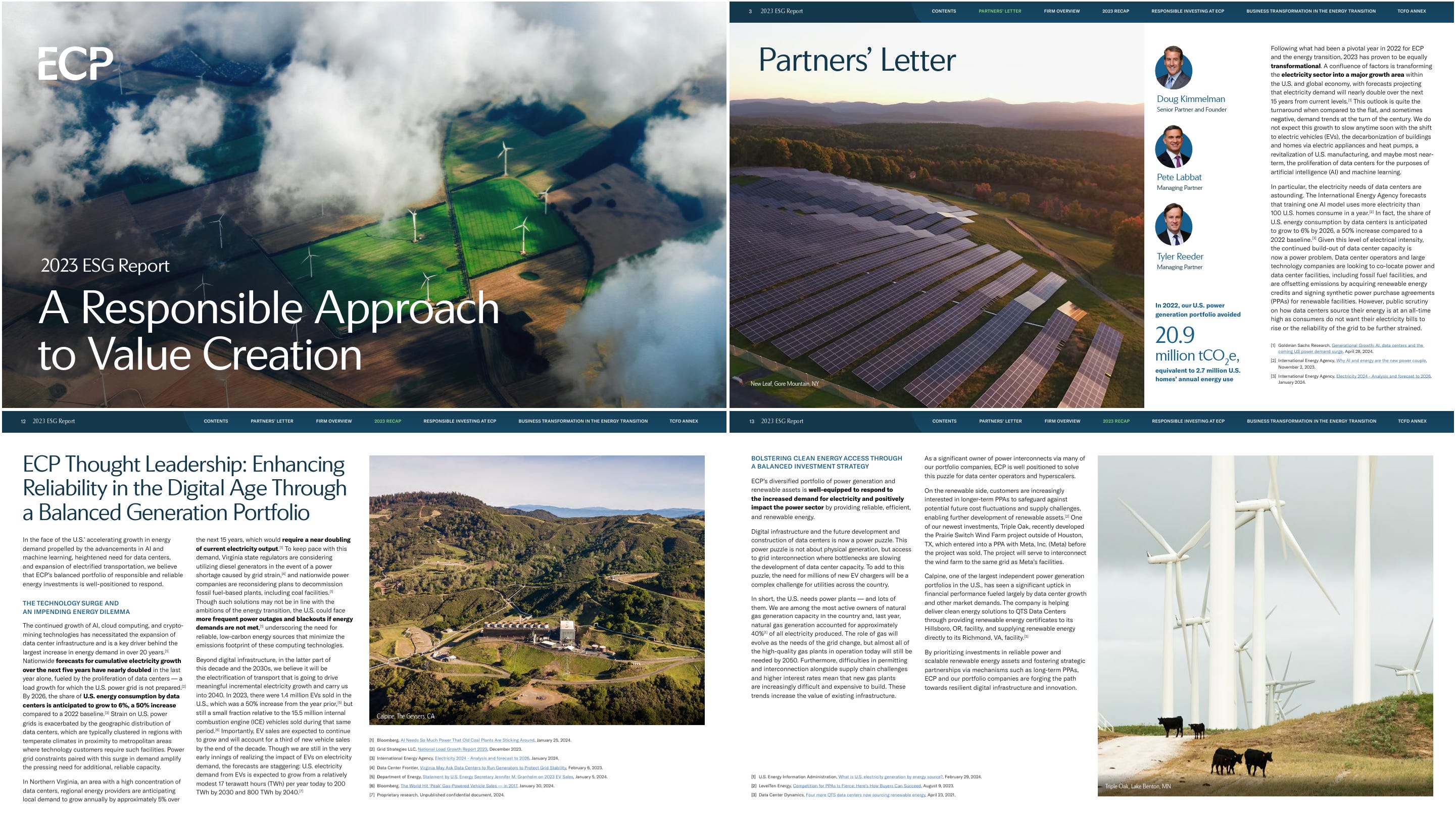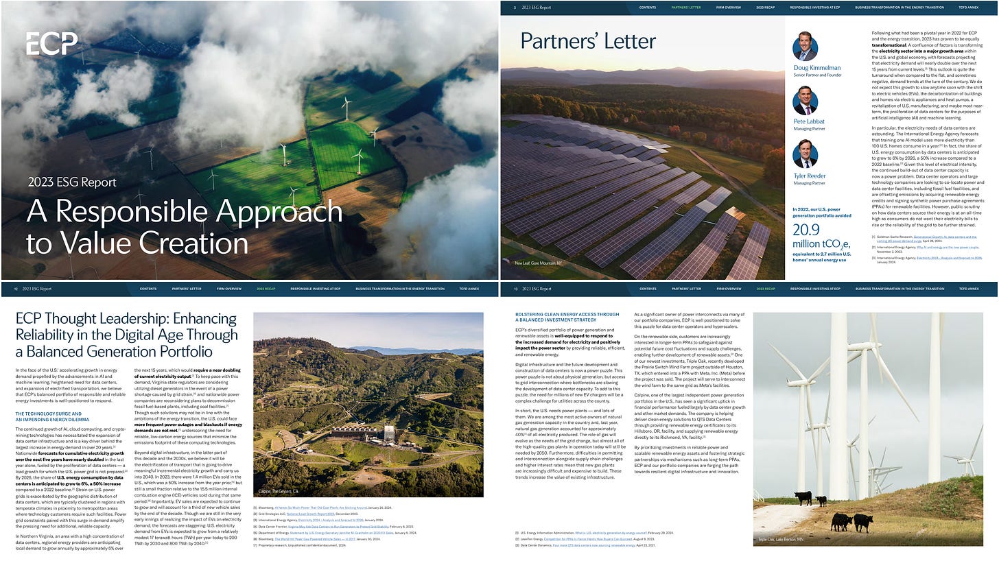 Let’s take Energy Capital Partners’ 2023 ESG report (which it calls “A Responsible Approach to Value Creation”) as an example—though many other investment firm reports are equally representative of the broad narrative framing. It presents the rise of AI, data centers, and EVs as a naturalized, quasi-inevitable source of load growth. That demand is not framed as the outcome of strategic corporate choices, regulatory decisions, and public subsidies, but as a kind of secular force to which investors must adapt. On that basis, the firm defends a “balanced portfolio” in which long-lived gas (and even coal) assets are recoded as responsible contributions to grid reliability in an era of AI-driven strain and interconnection bottlenecks. The effect is to turn what might otherwise appear as aging, carbon-intensive plants into future-proofed infrastructure keyed to a glamorous new demand narrative.
